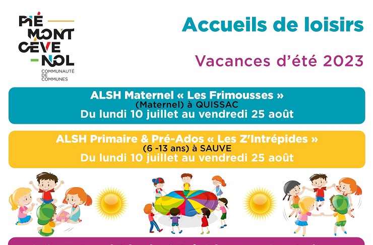 Les dates et modalités d’inscription dans les 4 accueils de loisirs lors des vacances d’été sont disponibles sur le site internet CCPC : https://www.piemont-cevenol.fr/accueils-de-loisirs/
