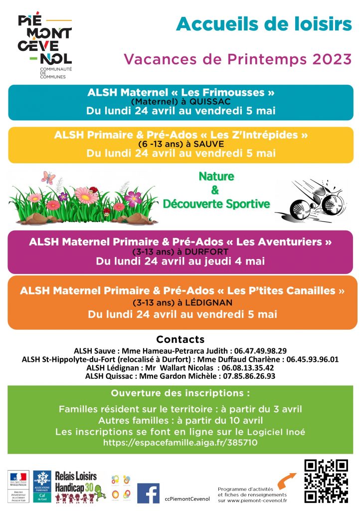Les dates et modalités d’inscription dans les 4 accueils de loisirs lors des vacances de printemps sont disponibles sur le site internet CCPC : https://www.piemont-cevenol.fr/accueils-de-loisirs/