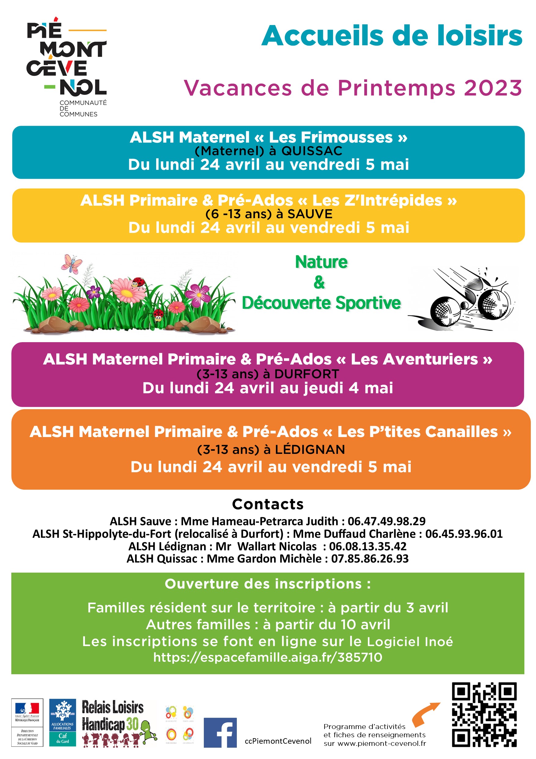 Les dates et modalités d’inscription dans les 4 accueils de loisirs lors des vacances de printemps sont disponibles sur le site internet CCPC : https://www.piemont-cevenol.fr/accueils-de-loisirs/